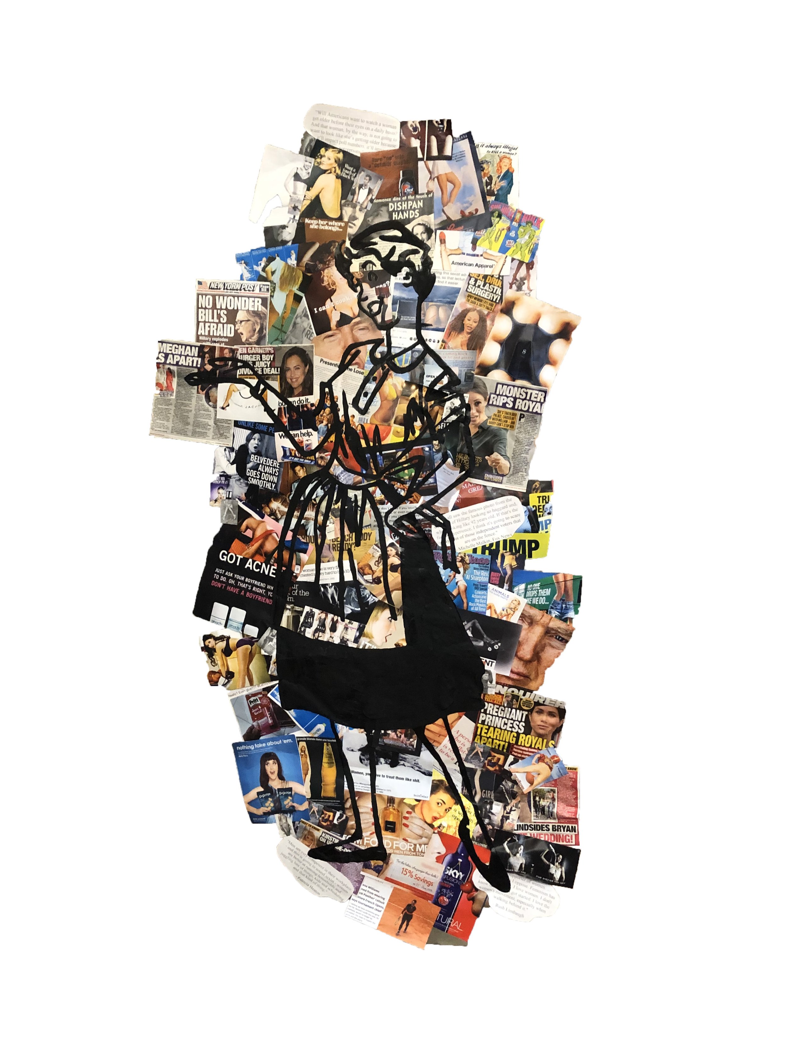 This is a found media, and digitally fabricated piece, that was pieced together digitally then, printed large scale, and painted on with black ink.